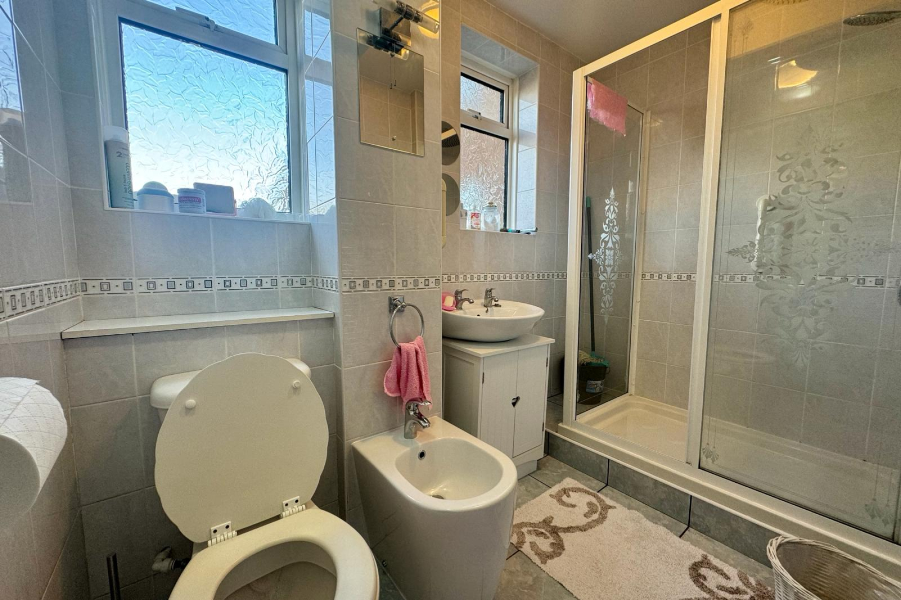 The bathroom is bright and airy and has a W.C, wash hand basin, bidet, double shower cubicle and a chrome radiator. There are splash back tiles, a tiled floor and a double glazed window to rear.