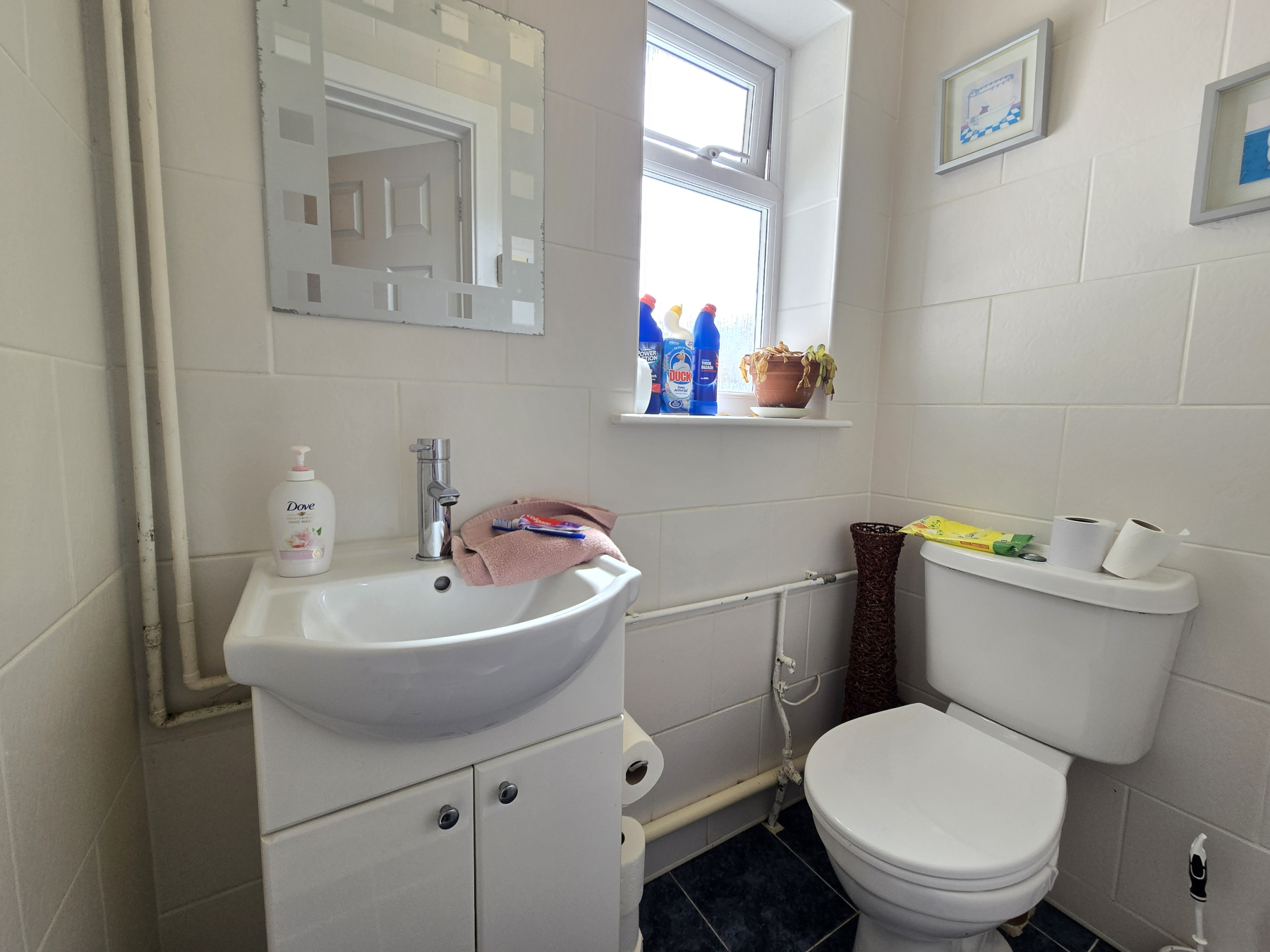 Convenient ground-floor cloakroom fitted with WC and wash basin. Patterned side window, radiator, and underfloor heating.