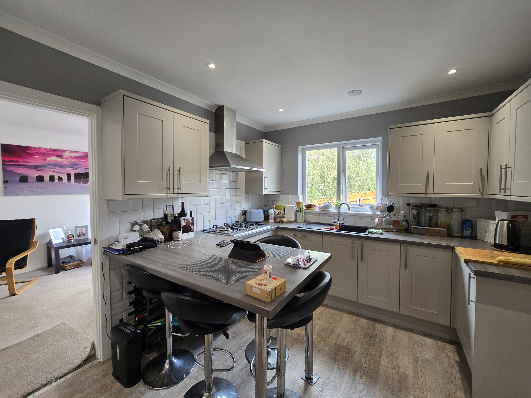 Stylish and functional, fitted with wall and base units, gas hob with extractor, electric oven and grill, integrated dishwasher, sink, and breakfast bar with seating. Ample space for a breakfast table, with a rear window overlooking the garden. Door to utility.