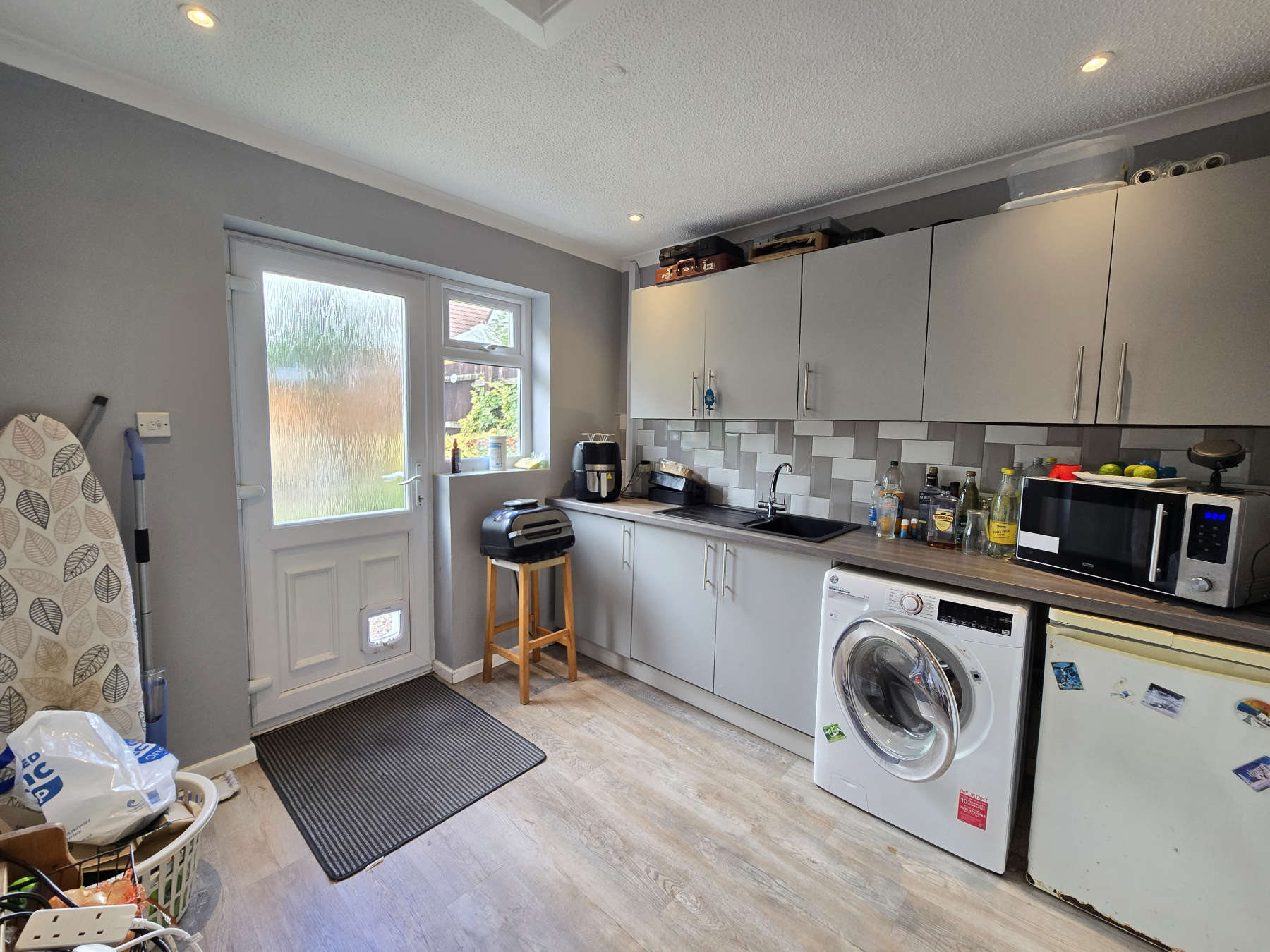 Generous utility space with fitted units, sink, loft access, and space for washing machine, tumble dryer, and American-style fridge/freezer. Rear-facing window, door to garden, and access into the garage.