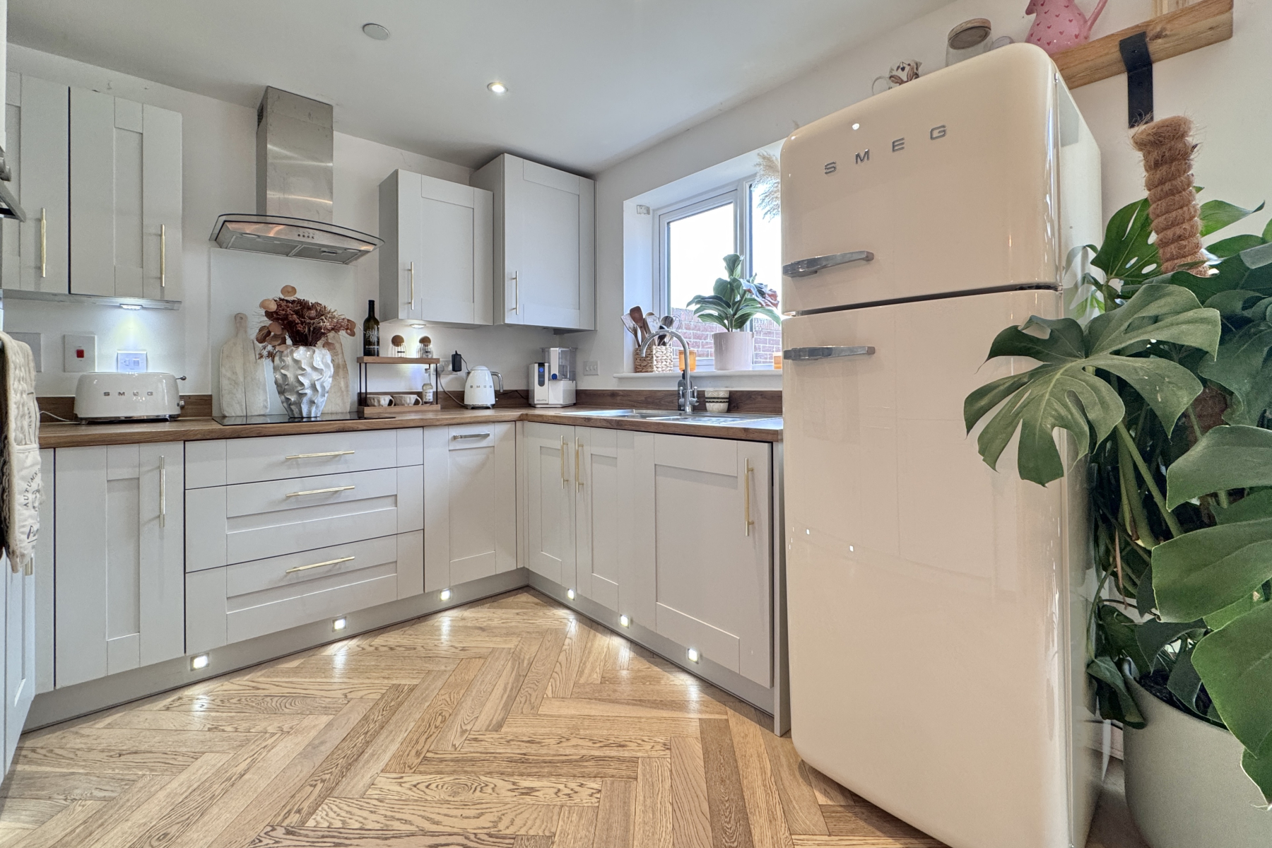 This beautifully upgraded shaker-style kitchen combines elegance with functionality, featuring oak-effect laminate worktops and subtle kickboard spotlights that create a warm, inviting ambiance. It includes an integrated oven and dishwasher, induction hob, and a 1.5 stainless steel sink positioned beneath a window overlooking the rear garden. There is ample space for a fridge freezer and a dining table, making it perfect for both everyday family meals and entertaining. French doors open directly onto the garden, allowing natural light to flood the space, while the stylish light oak herringbone flooring continues seamlessly from the lounge. The room also offers convenient access to a downstairs WC and under-stairs storage.