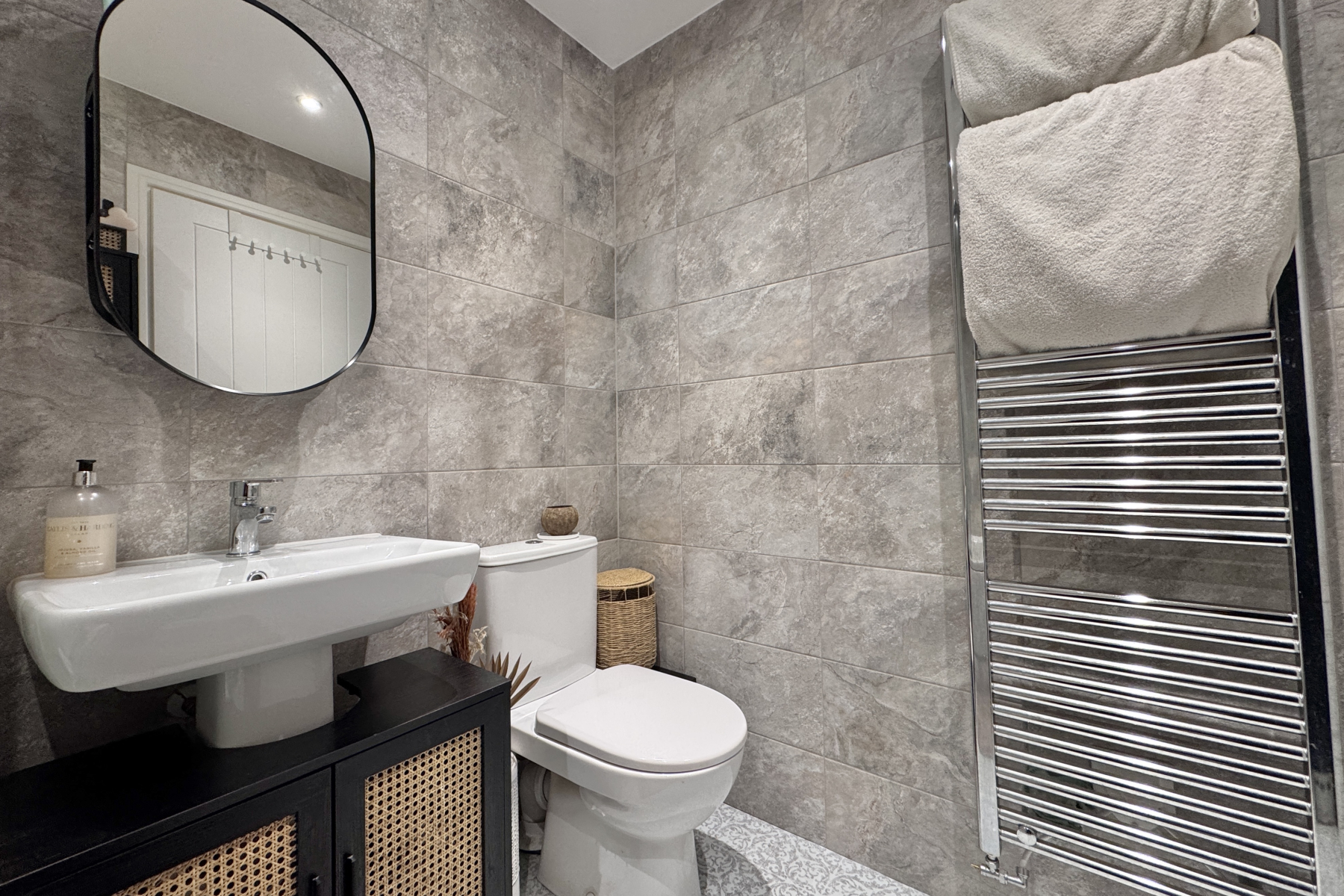 Stylishly finished with modern vinyl floor tiles, this beautifully decorated cloakroom features a pedestal wash basin, WC, and a sleek wall-mounted radiator.