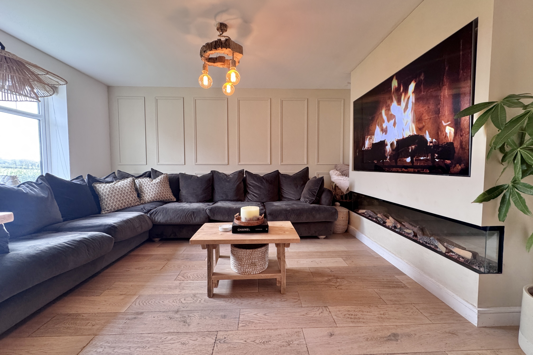 Beautifully decorated in a natural, contemporary style, this room features light oak herringbone flooring and a front-facing window that fills the space with natural light. An elegant media wall houses the feature fireplace and TV surround, while stylish wall panelling adds depth and character. The room flows seamlessly through to the modern kitchen and dining area.