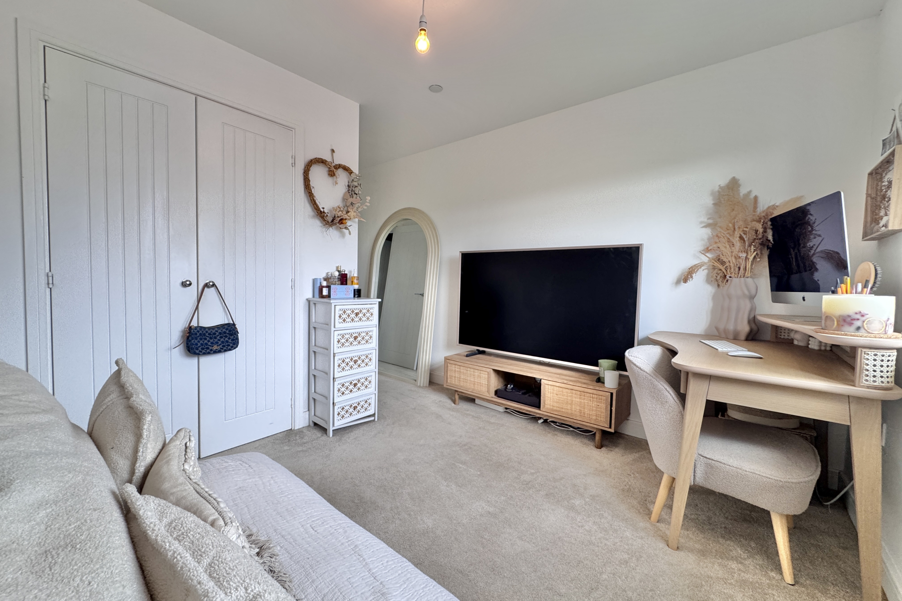 A versatile single bedroom, ideal for use as a child’s room, home office, or creative space. The room features soft carpeting, a window overlooking the front of the property, and a built-in storage cupboard above the stairs. Stylish wooden wall cladding adds warmth and character to the space.