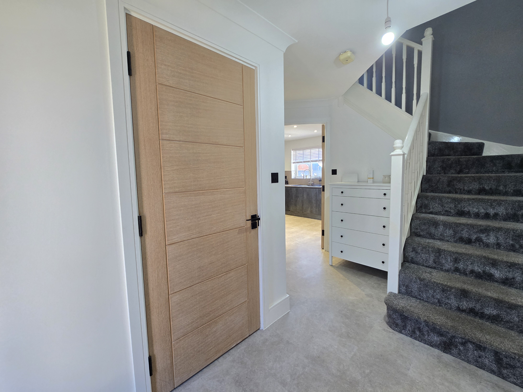 Entered through a modern front door, the hallway features smooth walls, a coved ceiling, and tile-effect laminate flooring. Carpeted stairs lead to the first floor. Double-glazed panel doors open into the lounge, while oak-style doors lead to the WC and kitchen/family room. Finished with a sleek black column radiator.