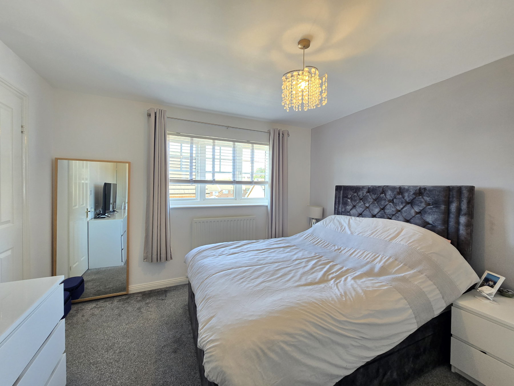 A spacious double bedroom with a rear-facing window, built-in wardrobes, central heating radiator, and access to a private en suite.