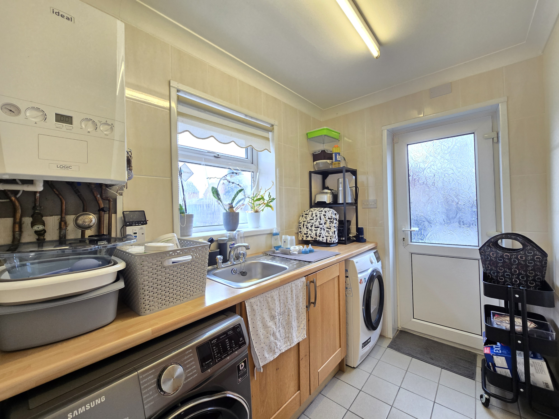Practical utility area with base units, worktops, and plumbing for appliances. Wall-mounted Baxi boiler, tiled floor and walls, radiator, and access to the WC/shower room.