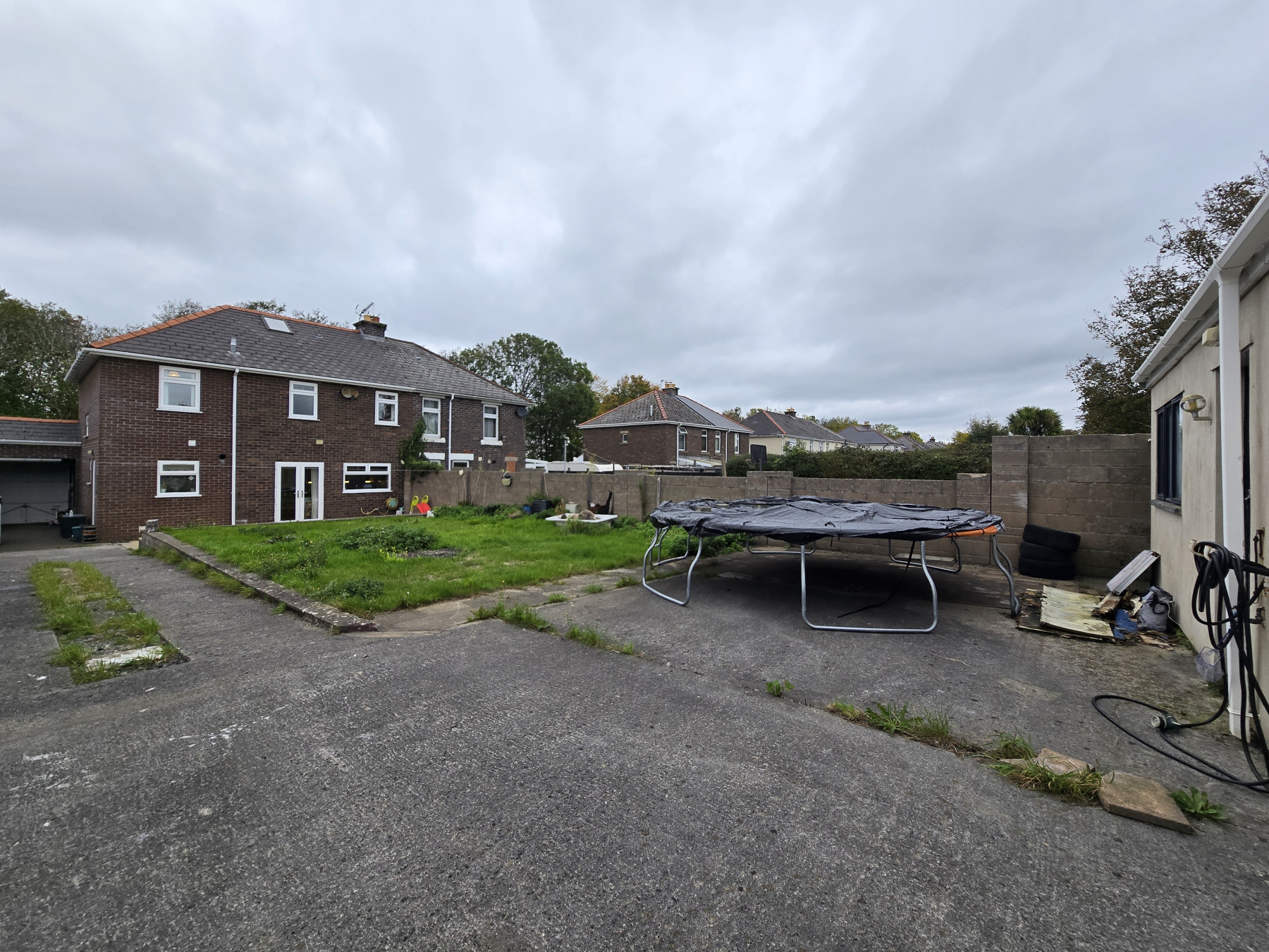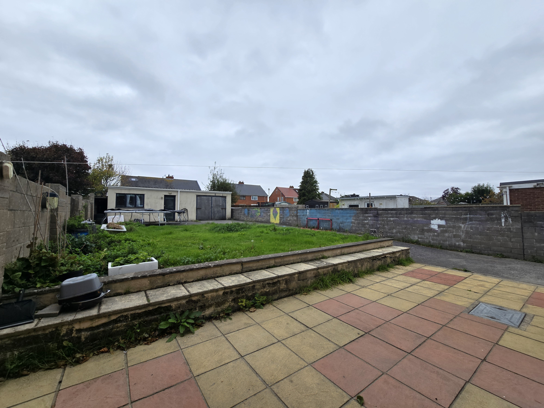 A generous south-facing garden offering a mix of patio, level lawn, and further concrete section currently housing a swimming pool. Securely enclosed with block walling, outside tap, and lighting.