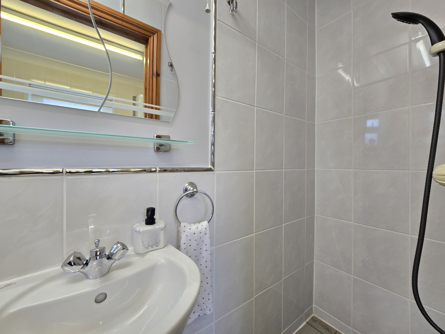Fitted with WC, pedestal wash basin, and walk-in shower with thermostatic controls. Tiled flooring, extractor fan, and opaque side window.