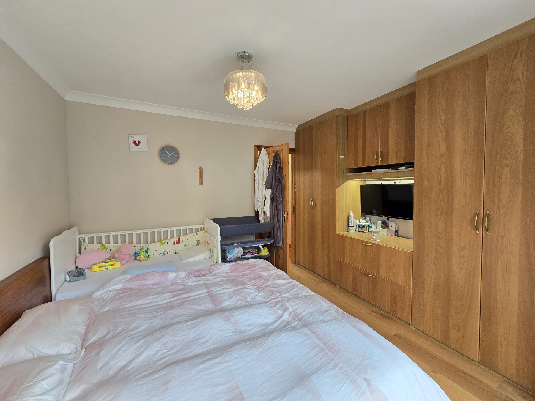 A bright and airy master bedroom with front-facing bay window, fitted wardrobes and drawers, smooth walls, coved ceiling, and radiator.