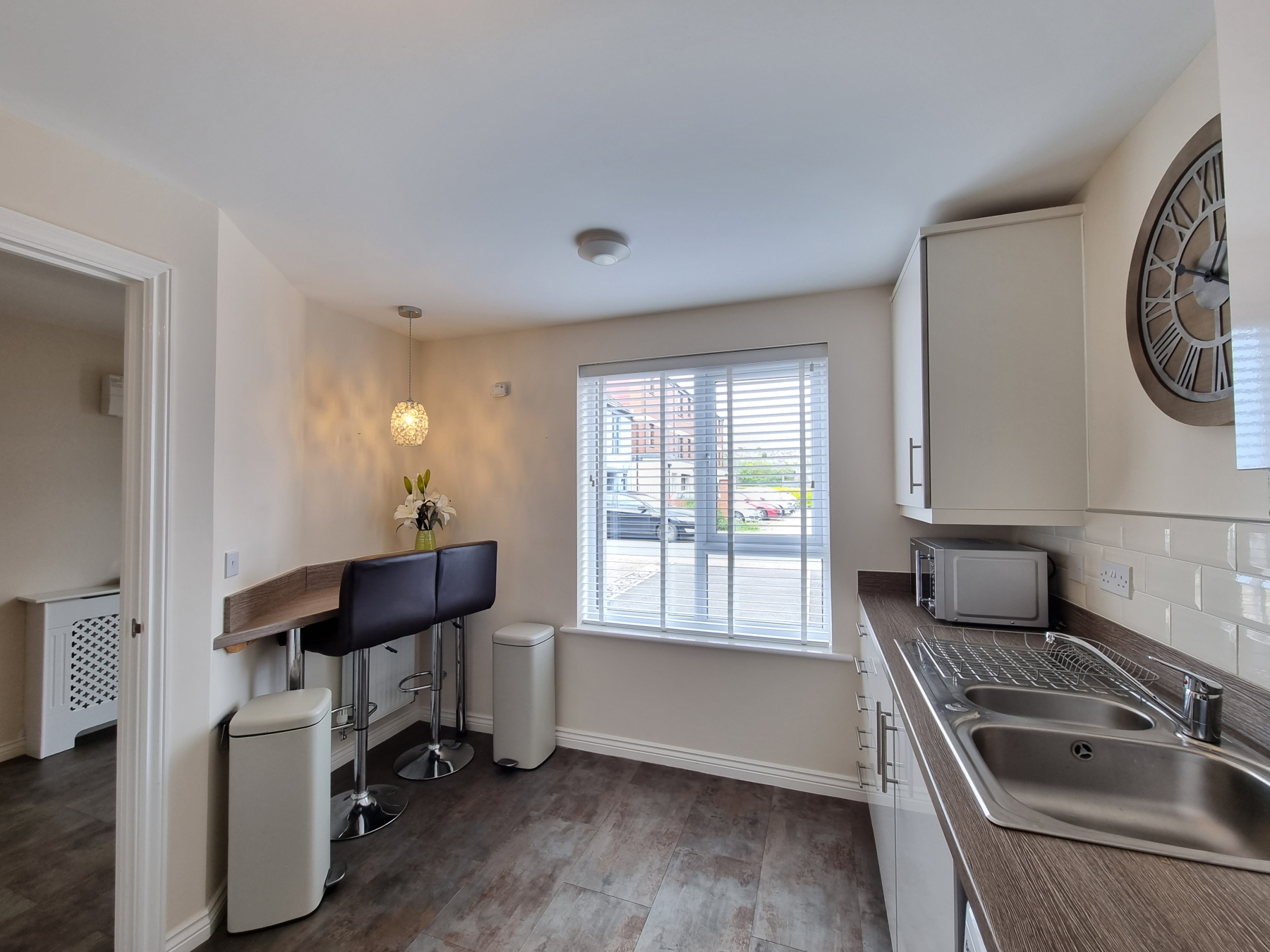Breakfast bar with seating area and light fitting above and wall mounted radiator below. UPVC window to front elevation with slatted blinds. Gas hob with stainless steel splash back and extractor fan above and integrated electric oven beneath. Stainless steel 1.5 sink. Space for washing machine and fridge freezer. Laminate wood effect worktops and partially tiled walls. 3 x double sockets. Matching over and under cupboards with boiler enclosed within. LVT flooring.
