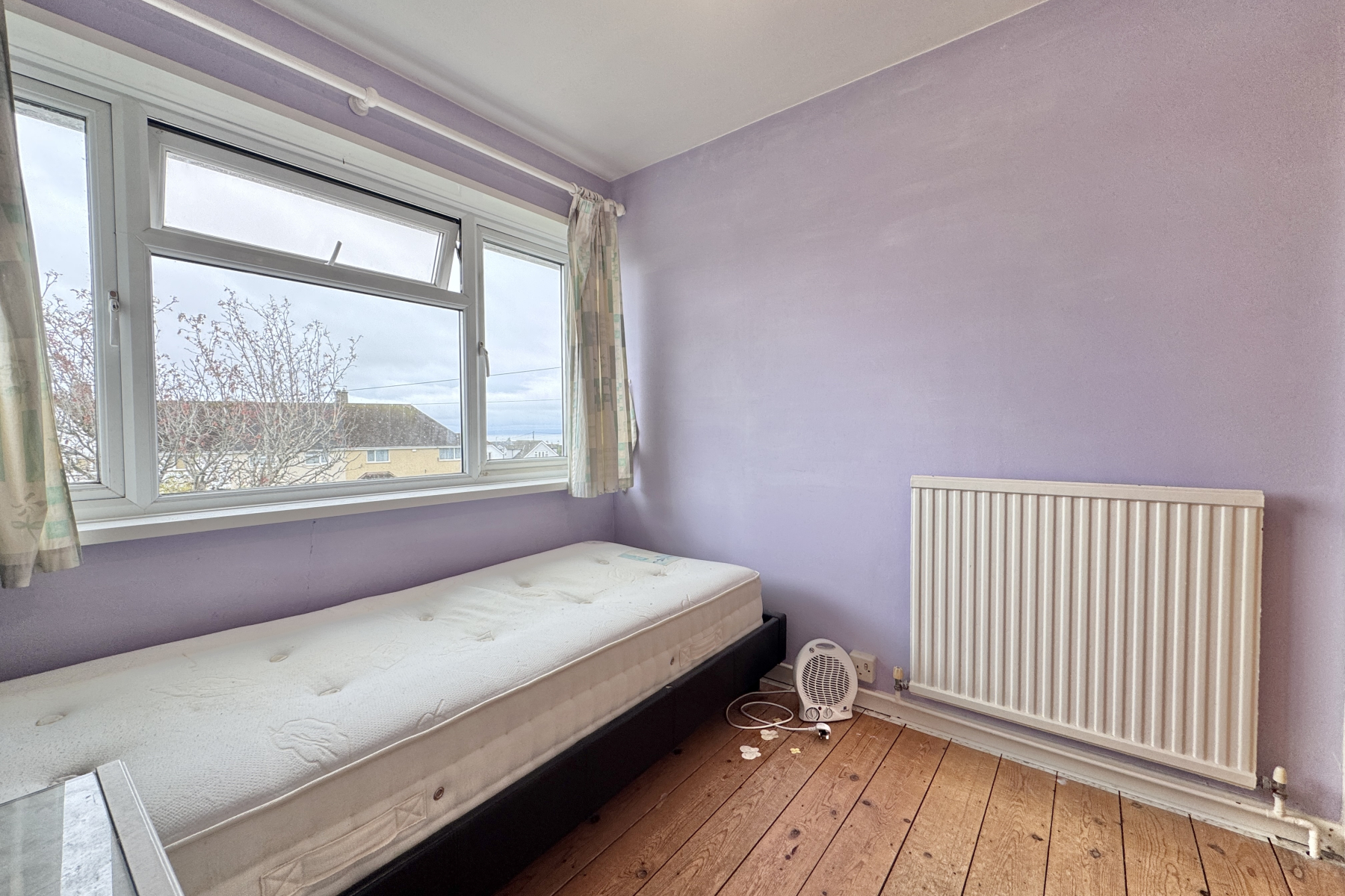 A single bedroom at the front of the property, featuring wooden flooring, space for a wardrobe or storage, and partial views of the channel.