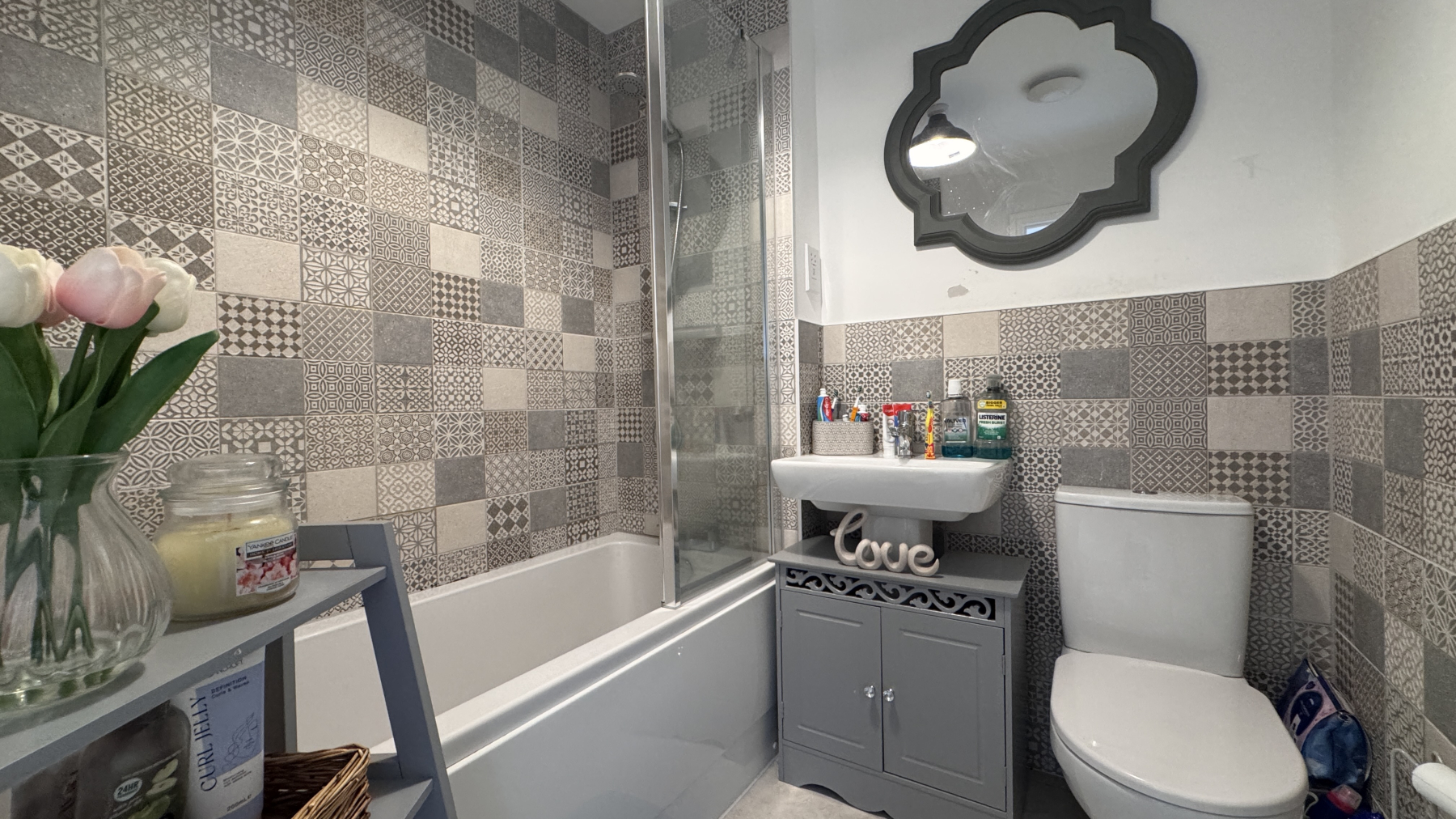 Pristine white suite comprising of WC, sink and bath with shower overhead with foldable shower screen, partially tiled walls and matching wash hand basin. Light fitting in centre of ceiling. Vinyl floor. Radiator and extractor.